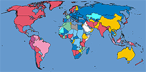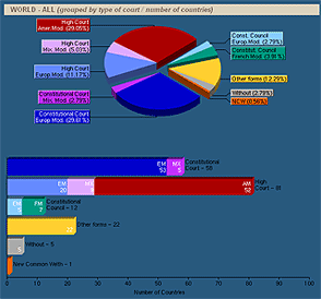 The map presents the aforementioned constitutional and judicial review models arranged by main regions: Europe, Eastern Europe, Africa, Asia, the Middle East as well as North, Central and South America. These models are presented by different colours.
